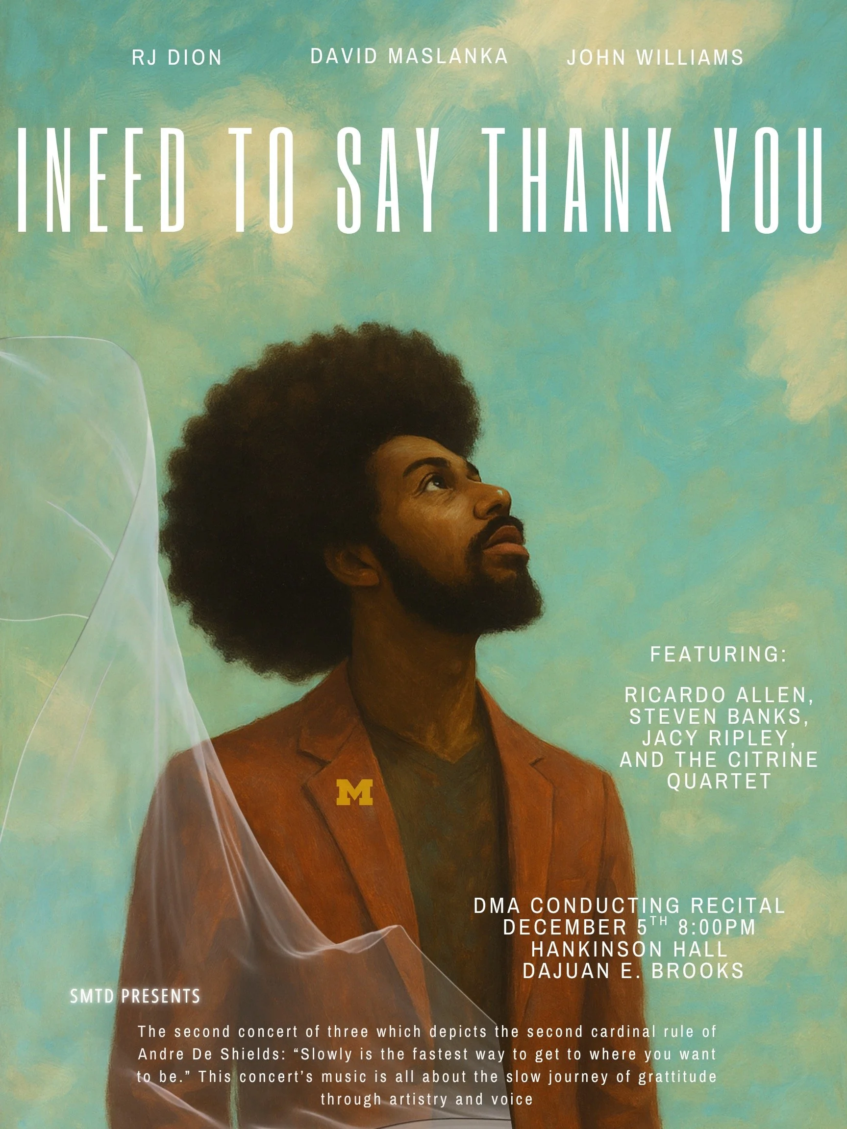 The Premiere of “I need to thank you” a Soprano Saxophone, Saxophone Quartet Concerto with Chamber Winds will be apart of DaJuan E. Brook’s 2nd recital towards the Doctorate in Wind Conducting at the University of Michigan.