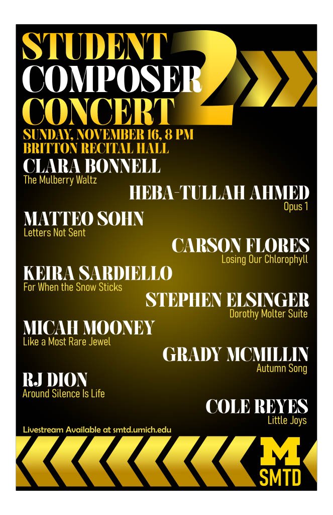 Presented by the Department of Composition, the Student Composer Concert Series features new works written by University of Michigan undergraduate and graduate students.